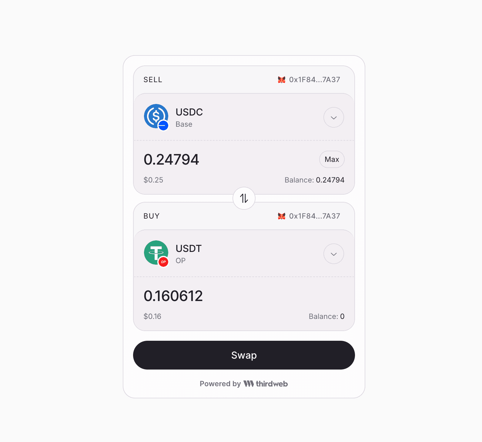 You can use the SwapWidget component to easily integrate a token swap interface into your app